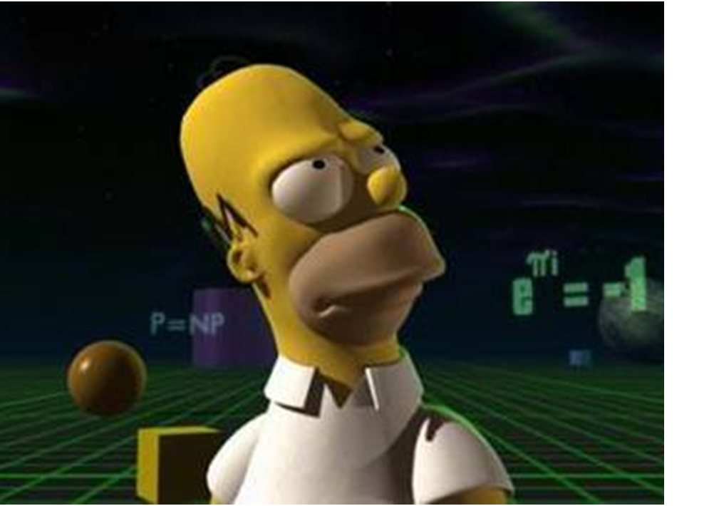 That’s a real snap from the Simpsons by the way; Homer’s brief dalliance with the world of mathematics. What’s interesting is that most of the equations and suchlike that float around Homer in this episode are known to be true. (The thing on the right, for example, is one of the most remarkable equations in mathematics. If you add 1 to both sides, it ties together the five key values known to mathematicians.) P = NP stands out as being something we don’t think is true. As MIT’s Scott Aaronson puts it,