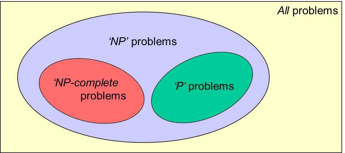 OK, there’s a huge assumption here of course. We’re working on the basis that the best or only way (algorithm) to solve a TSP is to try out all the possible routes, one at a time, to see which is best, and that might be as silly as it was for problem 2 at the start of this piece. If there’s a better way, it might not take anything like as long. Well, here’s the thing … no-one knows of an algorithm that’s very much better than the exhaustive search method we’ve been describing. (There are alternatives that bring the run time complexity down a bit, but not much, and generally at the expense of eating up huge amounts of memory space as they run. There are also a variety of approaches that exploit particular features of particular cases, but we’re talking in general terms here.) So does that mean that there’s no alternative method that’s (significantly) better? No, it just means we haven’t found one. By the same token, no-one’s ever proved that no such improved algorithm exists. So, where does that leave us?