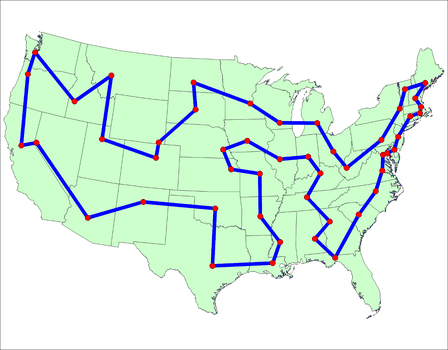 Let’s take a more interesting, actually a quite famous, example … The Travelling Salesman Problem (TSP) (yes, nowadays it should probably be the Travelling Salesperson Problem or something more politically correct but it just isn’t) models an itinerant pedlar moving from place to place, trying to sell their wares. In general terms they have to visit a number (usually ‘n‘) cities in some order, typically returning to where they started from. Assuming we can agree what we mean by ‘best’ in any given context (distance, cost, time, etc.), what’s the best order in which to visit the cities? Easy enough? Well, just consider how big the problem might be before we go any further.