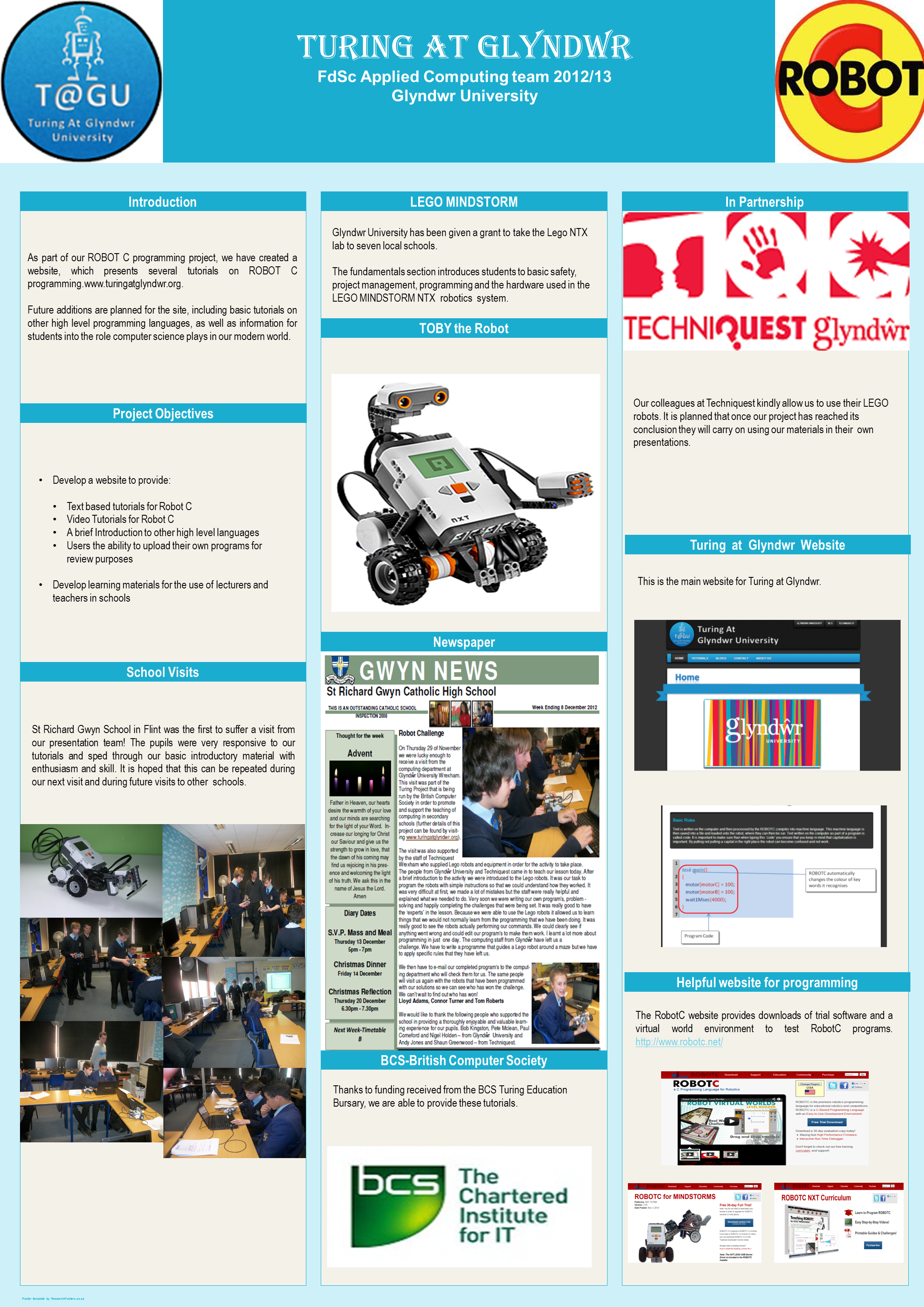 In 2012, the BCS Academy named their annual educational bursaries the ‘Turing Awards’, in honour of the centenary of the birth of Alan Turing . C@G applied for, and was granted, one of the 30 grants awarded and the Turing@Glyndŵr (T@G) project was born, initially planned to run over the academic year September 2012 to June 2013.