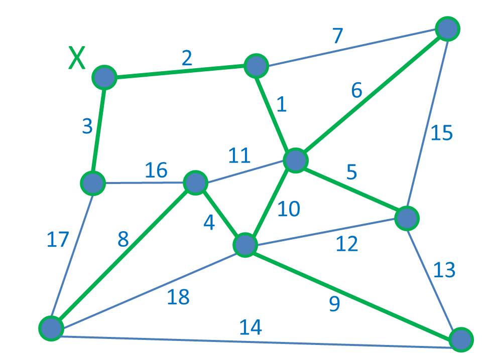 Kruskal’s Algorithm simply adds least cost edges anywhere in the graph, in increasing order, with the simple constraint that no added edge creates a loop with those (green) edges already there.  (A tree has no loops.)  Prim’s Algorithm, on the other hand, starts from one specific green vertex and, at each iteration, adds the cheapest edge connecting the green part of the graph to the blue part (thus spreading the green part).  So, for our example, Kruskal would add edges 1, 2, 3, 4, 5 & 6 before considering edge 7.  This would create a loop with edges 1 and 6, so isn’t allowed.  Instead, edges 8, 9 & 10 are added to complete the MST.  Prim, starting at vertex X, would build the MST edges in 2, 3, 1, 5, 6, 10, 4, 8 & 9 order.  Kruskal’s and Prim’s algorithms produce the same (optimal) tree and both can be implemented efficiently in code.  How cool is that?