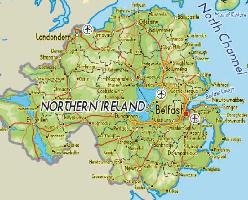 Well, of course, we know what a road network generally looks like and it’s not a tree.  In a real road network, we’d expect to see both alternative routes and short routes between close neighbours.  Both of these are usually achieved by building the network in the form of a hierarchy of partial meshes.  A network of local roads connects the entire county but has a further network of major roads overlaid upon it.  At the highest level, motorways connect major cities.  This is what the Northern Ireland road actually looks like (with most of the minor roads left off).