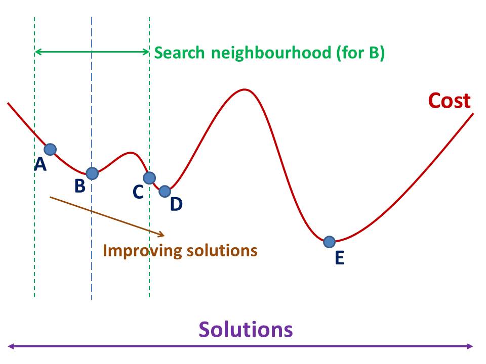 Local search algorithms look in a ‘neighbourhood’ of the current solution for something better (i.e. lower cost).  This generally means varying some parameters of the current solution but probably not too many at once and/or not too much (otherwise it gets too complex).  If anything ‘good’ is found then that becomes the new current solution and the process repeats – usually until there aren’t any more improvements.  Unfortunately, that doesn’t guarantee optimality (the best possible solution).  There are various ways to visualise this – this being the simplest ‘one-dimensional’ view  …