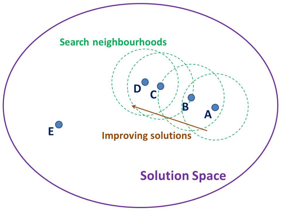 Here, different solutions have different costs and we’re looking for the lowest.  Starting from the initial solution, A, the local search neighbourhood includes the better solution, B, which becomes the new solution.  Starting again from B, the search reaches C, which is better still, and then finally D.  Sadly, the scope of the search is never wide enough to reach E, the true optimal solution.  In two dimensions, it might look like this …