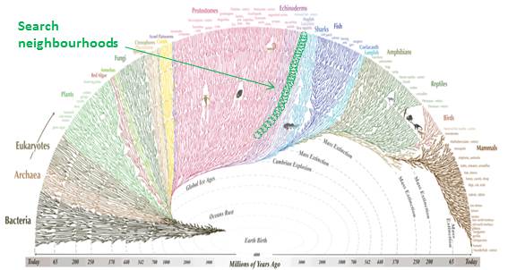 There’s a reasonable chance that we’re about the right height, weight, proportion, that our skin is the right thickness and our sight and hearing as good as they need to be because any subtly different, better design would probably be found by the AoE’s iterative local search process acting on the current solution and finding improvements, if there are any, within its range.  (Although it’s possible it may not have quite got there yet: we could still be following our mysterious cost function downhill.)  But how about more drastic changes; solutions much further away in the solution space?