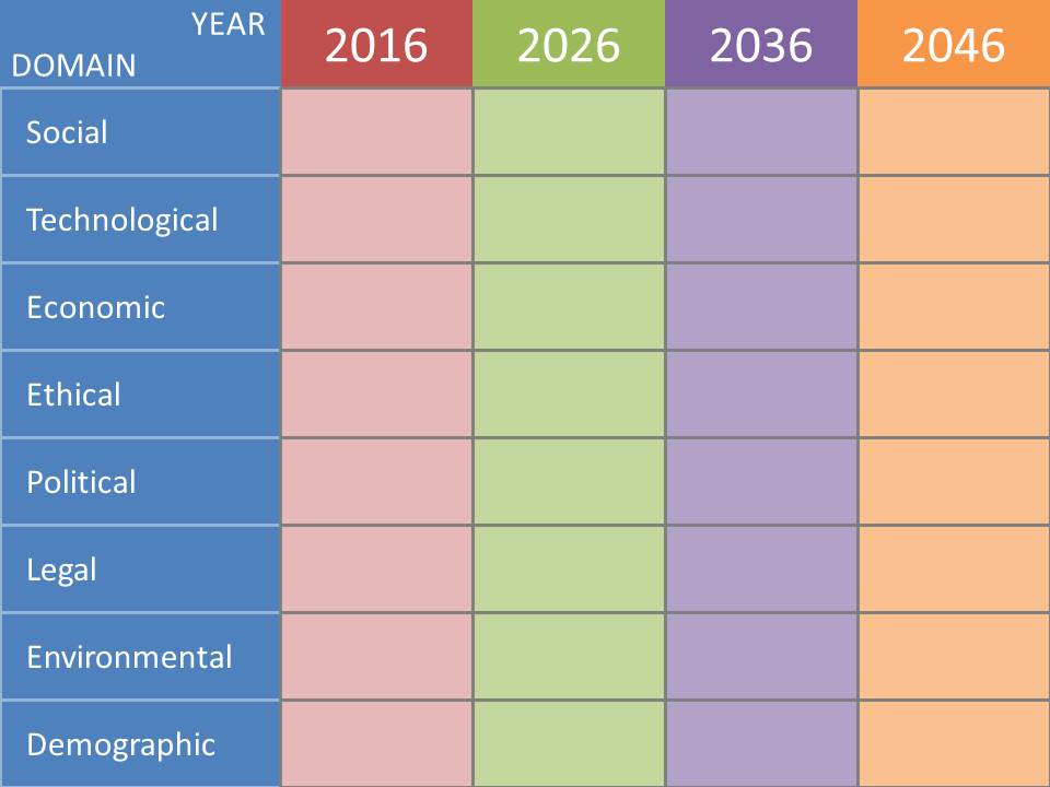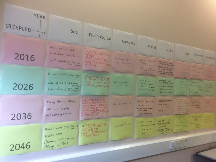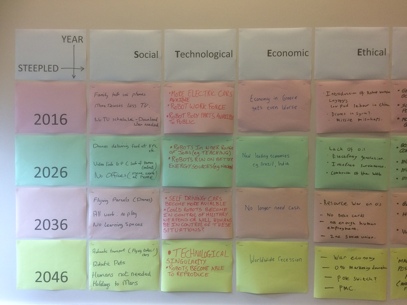 Divide the group into sub-groups and, depending on numbers, allocate each sub-group either a complete STEEPLED category (‘Social’, ‘Technological’, etc.) or (for very large groups) a STEEPLED category and year (2016, 2026, 2036 and 2046) – or some suitable compromise. (You can try to look further into the future if you like but, in practice, it doesn’t achieve much – see later – and 2046ish is some people’s estimation for the Kurzweil Singularity anyway and it may be difficult to look far beyond that.)