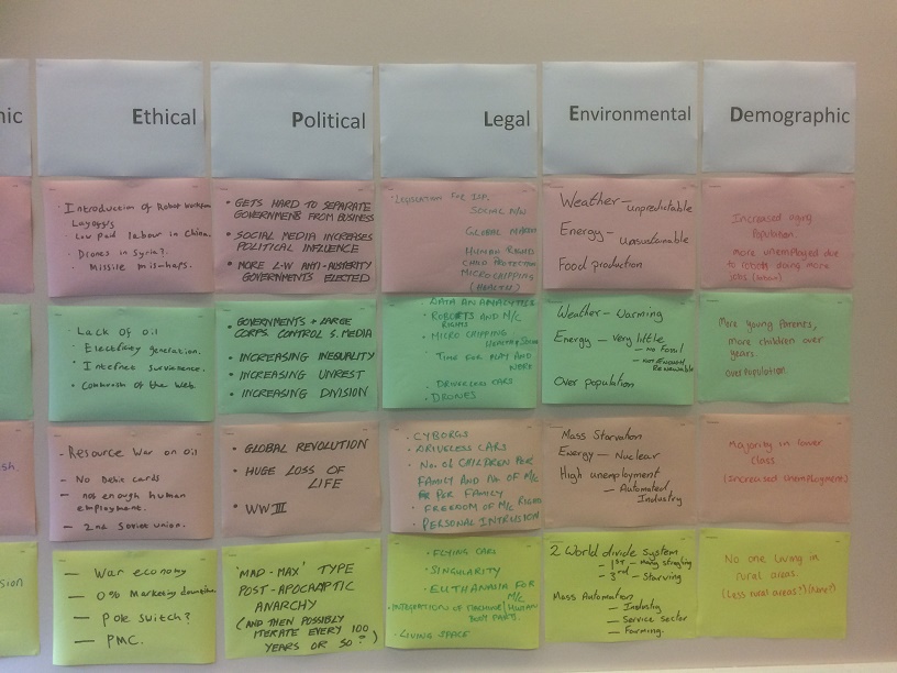 Once, the chart is complete to everyone’s satisfaction, take a step back (literally if you’ve stuck them to the wall) and see if there are any patterns that emerge. In particular, read down the columns for each year in turn (across all STEEPLED categories). If your group is right (even only partially), this will be a snapshot of what the world might be like in that year trying to take the bigger picture into account.