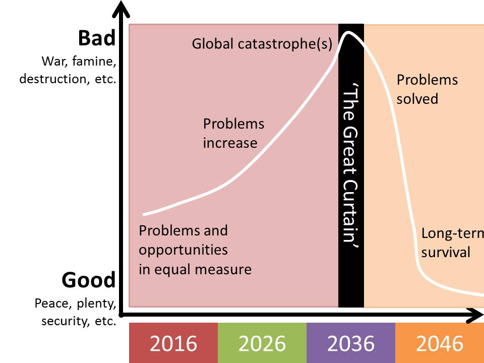 Although detail varies considerably, the essential story, repeated consistently, is that of ‘The Great Curtain‘ (TGC). This is the general belief that humanity will have to pass through a key period of, possibly devastating (environmental, social, technological, economic, political, etc.) crisis before being allowed to settle down to a permanent and stable future. The only point on which there isn’t universal agreement is whether we survive at all – we may not be able to get beyond ‘The Great Curtain’. It’s certainly hard to see past it. (Hence the name.) An alternative scenario is that the cycle will repeat over time.