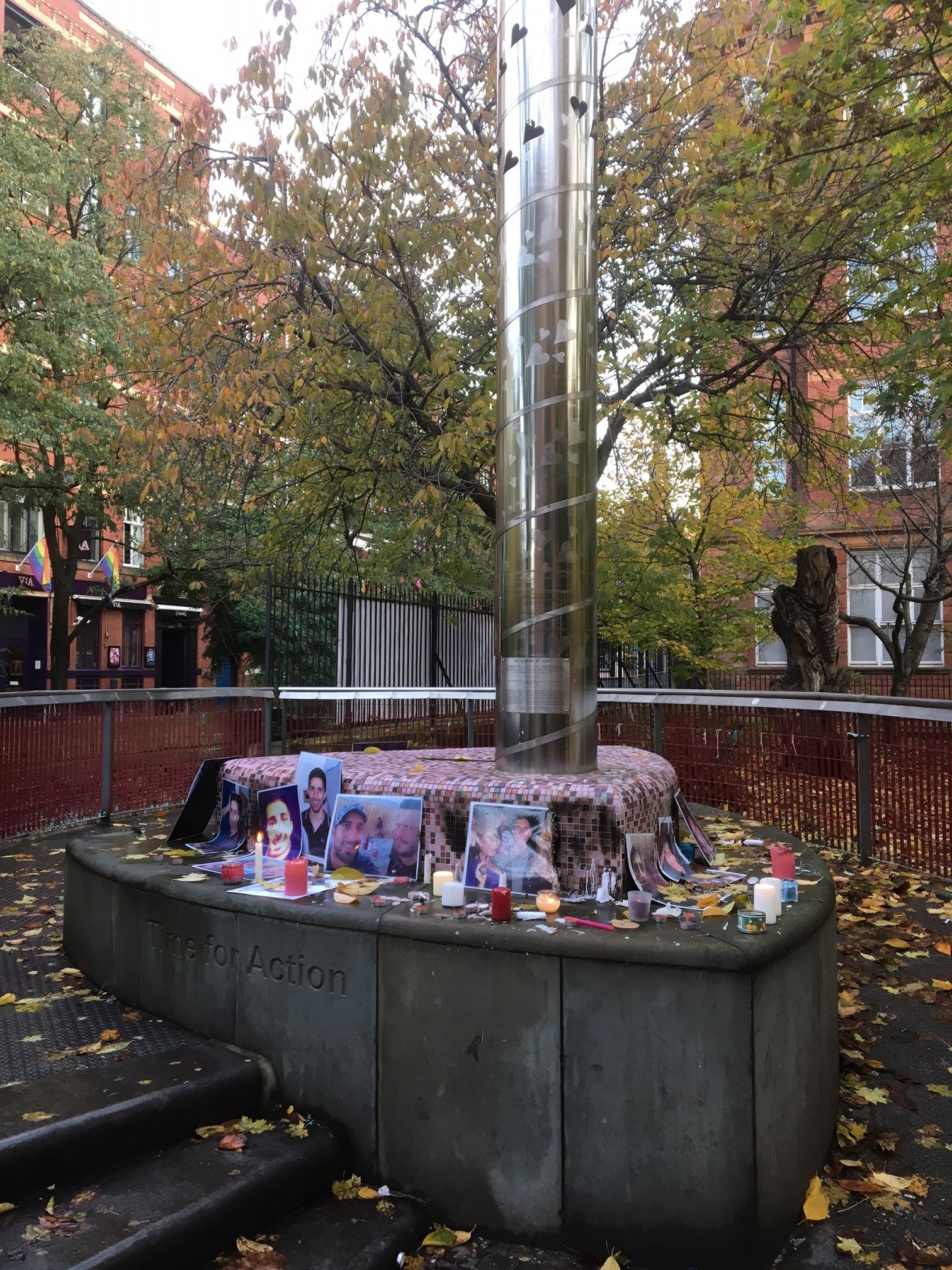 Turing’s memorial is close to the centre of the park.  At the end, nearer to ‘The Village’ on Canal Street, stands the ‘Beacon of Hope’, the UK’s only fixed memorial to those living with, or already lost to, HIV/AIDS.  Both are frequently adorned with flowers, photographs and candles.