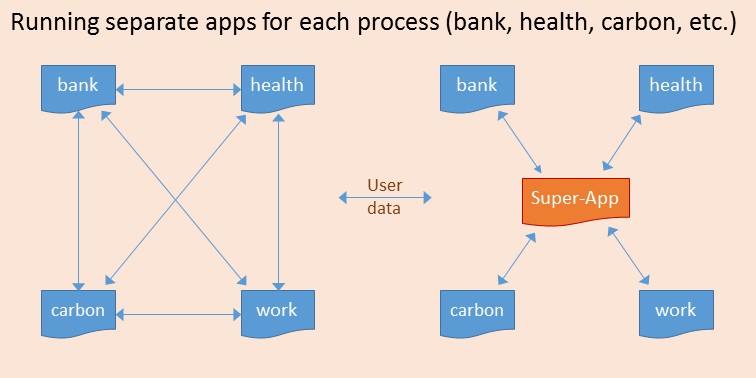 • The SuperApp updates the user’s ‘personal ledger’ across all domains and relevant actions (payments, etc.) are made at the end of each day (say)