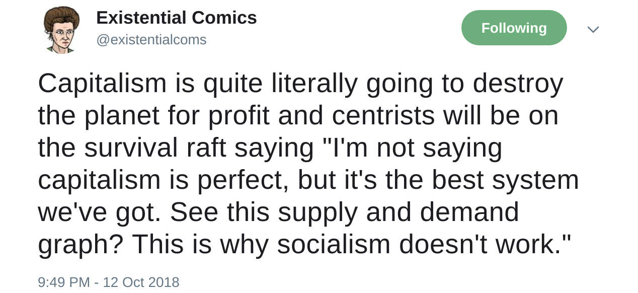 Finally, if you really want to see how powerful capitalism’s hold is, just take a look at the criticism articles like this attract and the dodgy logic that follows.  There’s overwhelming evidence that capitalism is going to destroy the planet (in far more credible outlets than this one) but, if you don’t want to believe that, then fine: it goes like this …