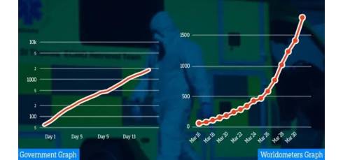 Of course, it doesn’t take long to solve the mystery. Look at that y-axis – the one showing the number of deaths plotted against days (the x-axis). Instead of going 100, 200, 300, as we might expect, the main grid values go 100, 1,000, 10,000. Is that rather odd?