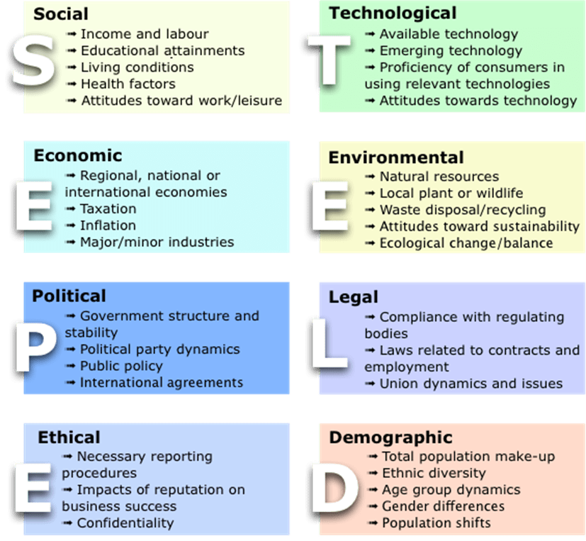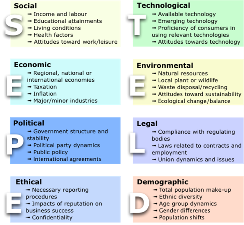 In terms of content, there’s probably no great problem including Social, Technological, Economic, Environmental, Political, Legal and Ethical. The Environmental and Ethical dimensions almost certainly need more prominence these days but we’ve already suggested that the ‘E’s are interchangeable.