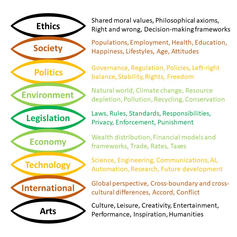 The (positive and negative) references to climate change here give a welcome prominence to the Environmental dimension. We can also take the opportunity to ‘promote’ Ethics as well, and International and Arts, whilst every bit as significant, are highlighted at the end as the ‘recent additions’. We thus have a new model: